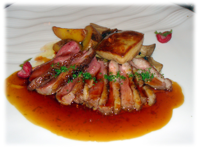 『フランス シャラン産 鴨のロースト、フォアグラのテリーヌ、ちりめんキャベツとポルチーニ茸の蒸し煮』